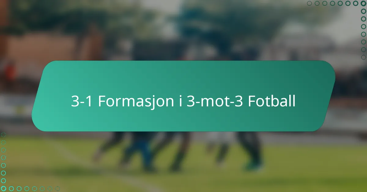 3-1-formasjonen i tre-mot-tre-fotball er en strategisk oppsett som har tre spillere fokusert på forsvars- og midtbaneroller, mens én spiller tar på seg angrepsposisjonen. Denne formasjonen skaper en balanse mellom offensivt og defensivt spill, noe som gjør at lagene kan skape scoringsmuligheter samtidig som de forblir årvåkne mot kontringer. Dens design fremmer en sterk tilstedeværelse på midtbanen, selv om den kan ha begrensninger sammenlignet med andre formasjoner som 2-1 og 1-2.